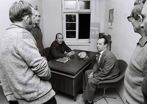 Rozmowy prezydium MKS z wojewodą Januszem Owczarkiem. Na zdjęciu widoczni: Czesław Stawicki, Zbigniew Kopystyński, Jerzy Piórkowski i Janusz Owczarek.