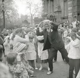 Imprezy kulturalne z okazji Święta Pracy we Wrocławiu. W Parku im. Hanki Sawickiej (obecnie Park Mikołaja Kopernika) odbył się festyn dziecięcy, na którym można było podziwiać występy akordeonistów, zespołów wokalnych i tanecznych. Korowody, konkursy i zabawy prowadził Stanisław Pasternak, czyli popularny Wujcio Stasio z MDK. N/z: niezrównany Wujcio Stasio podczas zabawy z dziećmi.