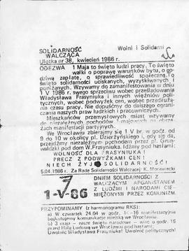 Awers: wezwanie do niezależnych manifestacji w dniu 1. maja, pod hasłami uwolnienia przewodniczącego NSZZ "Solidarność" Region Dolny Śląsk Władysława Frasyniuka i innych więźniów politycznych, zastopowania podwyżek cen i przedłużania czasu pracy; w dniu 24. kwietnia ma się odbyć bojkot komunikacji miejskiej, a 3. maja wiec przed Halą Ludową (ob. Stulecia) pod hasłem uwolnienia Frasyniuka i więźniów politycznych; 1. maja ma być też dniem solidarności z Afganistanem i innymi krajami ciemiężonymi przez komunizmRewers: opis szykan i tortur, jakim poddawany jest Władysław Frasyniuk w Zakładzie Karnym w Lubsku, m. in. pobicia, izolacja od rodziny, przetrzymywanie w zimnym pomieszczeniu; apel do związków zawodowych na świecie, partii politycznych, rządów krajów demokratycznych i opinii publicznej o wywieranie wszechstronnego nacisku w celu uwolnienia Frasyniuka; podpisali: przewodniczący Regionalnego Komitetu Strajkowego NSZZ "Solidarność" Region Dolny Śląsk Marek Muszyński, przewodniczący Solidarności Walczącej Kornel Morawiecki; u dołu ulotki wezwanie: "Podaj dalej"