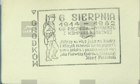 Okolicznościowa ulotka wytworzona przez internowanych w Ośrodku Odosobnienia w Grodkowie z nadrukiem przedstawiającym żołnierza oraz napisy: 6 SIERPNIA 1914-1918 68 ROCZNICA WYMARSZU I KOMPANII KADROWEJ, "Patrzę na Was jako na kadry, z których rozwinąć się ma przyszła armia polska i pozdrawiam Was jako Pierwszą Kadrową Kompanię." Józef Piłsudski oraz pionowym napisem GRODKóW z lewej strony