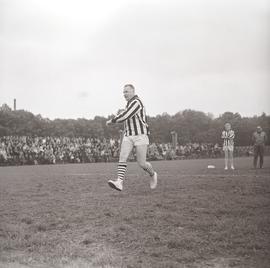 Mecz piłki nożnej pomiędzy wrocławskimi aktorami i dziennikarzami, 26 maja 1974 r. (1:1, w rzutach karnych 3:2 dla dziennikarzy). Drużyny wystąpiły w składach: Aktorzy - O'Ya, Galia, Kuźniar, Majcherek, Kłodnicki, Malec, Prochowski, Peszek, Sawicki, Turski, Grałek, Widera, Stawierski (rezerwowi: Chęciński, Kuziemski, Mrozek); Dziennikarze - Szmyrka, Próchniak, Jaworski, Werka, Kawa, Szwed, Adamczak, Zawadowski, Rozmarynowicz, Michalski, Kłykow, Skała (rezerwowi: Kita, Doliński, Kawalec). Mecz został poprzedzony pojedynkiem w rugby, jednak gracze przejawiali większe zainteresowanie beczką piwa. N/z: Bruno O'Ya (biegnie z piłką w rękach) w ataku na bramkę dziennikarzy (w koszulkach w pasy)