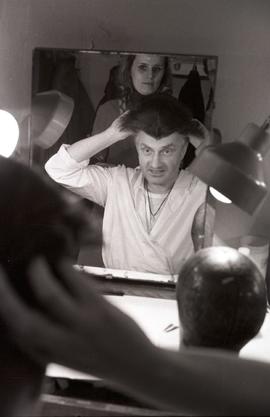 N/z Igor Przegrodzki w charakteryzatorni po lewej aktor zakładający makijaż.