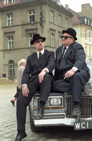 N/z Bogdan Zdrojewski i Zdzisław Smektała siedzący na masce czarnego Cadilaca na wrocławskim Rynku.