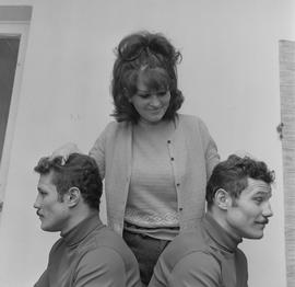 Grupa młodych mężczyzn wypoczywających nad basenem, wśród nich (na wieży, trzeci na lewej) Jerzy Jędrzejczak.