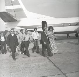 Wizyta delegacji burmistrzów miast amerykańskich we Wrocławiu, 16-17 lipca 1975 r. Na czele delegacji stał Kenneth Gibson (burmistrz Newark), ponadto w jej skład wchodzili: John M. Belk (burmistrz Charlotte), Edward Zorinsky (burmistrz Omaha), Alex P. Smekte (burmistrz Rochester, Minnesota), John Gunther (dyrektor Stowarzyszenia Burmistrzów Miast Amerykańskich) oraz towarzyszące im małżonki. N/z: delegacja na lotnisku Strachowice wraz z towarzyszącym im wicewojewodą wrocławskim Mikołajem Hankiewiczem.
