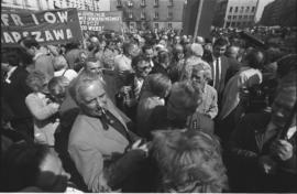 Warszawa 13-04-1989. Demonstracja OPZZ (Ogólnopolskie Porozumienie Związków Zawodowych). N/z w środku, na dole zdjęcia Alfred Miodowicz. Fot. NAF Dementi