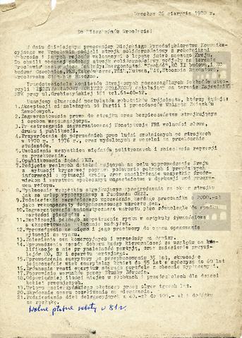 Międzyzakładowy Komitet Strajkowy informuje o strajku Miejskiego Przedsiębiorstwa Komunikacyjnego we Wrocławiu, podjętym w dniu 26.08.1980 w geście solidarności ze strajkującymi robotnikami na Wybrzeżu i innych miejscach Polski; strajk będzie kontynuowany do spełnienia żądań przez władze oraz do powrotu do pracy robotników Wybrzeża; MKS wzywa wszystkie zakłady do przyłączenia się do akcji strajkowej, z wyjątkiem kolumny sanitarnej i służb zaopatrujących ludność w podstawowe produkty i usługi; wyszczególniono 21 postulatów gdańskiego MKS i dopisano 3 dodatkowe: odblokowanie połączeń telefonicznych z innymi miastami Polski, rzetelne informowanie społeczeństwa o strajkach i postulatach, natychmiastowe wprowadzenie zakazu sprzedaży alkoholu na terenie miasta do 31 sierpnia; wyszczególniono wrocławskie zakłady, które do dnia 29 sierpnia 1980 r. przyłączyły się do strajku; u dołu 1 s. dopisek długopisem do 21 postulatów: wolne płatne soboty w 81 r.