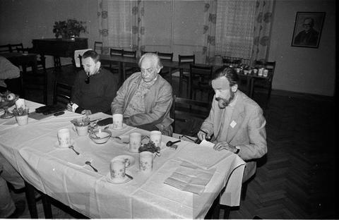 Wrocław, 23-05-1987. Krajowe Biennale Młodych „Droga i Prawda”, zorganizowane przez Duszpasterstwo Środowisk Twórczych, połączone z sympozjum nt. „Rozmaite rozumienie niezależności kultury i wolności twórcy”. N/z spotkanie w pałacu arcybiskupim od lewej: Maciej Gutowski, Zbigniew Karpiński, Aleksander Wojciechowski podczas spotkania w ramach sympozjum. Fot. NAF Dementi
