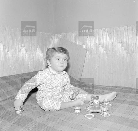 N/z dziecko siedzące na łóżku z miniaturową zastawą ceramiczną.