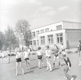 Dzieci wiejskie na wakacjach we Wroclawiu. N/z: dzieci ze wsi woj. olsztyńskiego na placu przed Szkołą Podstawową nr 47 przy ul. Januszowickiej, gdzie m.in. mieścił się jeden kilku przygotowanych obiektów kolonijnych.
