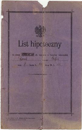 List hipoteczny na sumę 1700 złotch w złocie obciążający nieruchomość w miejsc. Borek [pow. gostyński, woj. wielkopolskie] będącą własnością Stanisławy Grymińskiej wydany przez Sąd Powiatowy w Koźminie, Koźmin 6.12.1934. [Dokument skłąda sie z dwóch części: właściwego listu hipotecznego oraz wypisu z aktu zeznania przed notariuszem drem Zbigniewem Dulębą.]