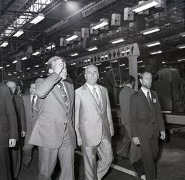 N/z delegacja KC PZPR w hali produkcyjnej Polaru. Stoją (od lewej) dyrektor zakładu Karol Popiel, I sekretarz KC PZPR Edward Gierek i I sekretarz KZ PZPR w Polarze Henryk Bakowicz.