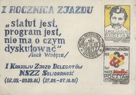 Kopertówka wydana z okazji I Rocznicy Krajowego Zjazdu Delegatów NSZZ Solidarność.