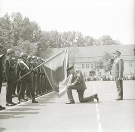 Wizyta załogi statku kosmicznego Sojuz 30 we Wrocławiu (lot w kosmosie 27 czerwca - 5 lipca 1978 r.), ppłk. Mirosława Hermaszewskiego i gen. mjr. Piotra Klimuka. N/z: odwiedziny kosmonautów i towarzyszącej im ekipy w 11 Brandenburskim Pułku Lotnictwa Myśliwskiego OPK im. Osadników Dolnośląskich we Wrocławiu (JW 1465), w której M. Hermaszewski w 1976 r. był dowódcą. Na placu apelowym kosmonauta klęka przed sztandarem bojowym jednostki, za nim stoi dowódca Wojsk Obrony Powietrznej Kraju gen. bryg. Longin Łozowicki