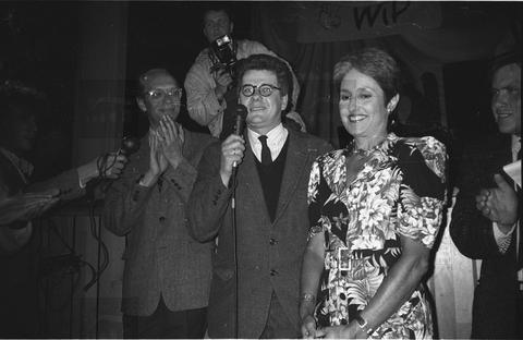 Warszawa, 07-06-1989. Występ Joan Baez w domu kultury na terenie fabryki traktorów Ursus. N/z w środku Jacek Czaputowicz i Joan Baez. Fot. NAF Dementi