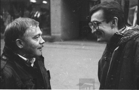 Wrocław, 03-11-1989 (do 05-11-1989) Karel Kryl podczas pobytu we Wrocławiu. W ramach Przeglądu Czechosłowackiej Kultury Niezależnej dal kilka koncertów: min w Teatrze Polskim i w klubie „Cegiełka”. N/z z prawej Józef Pinior. Fot. NAF Dementi