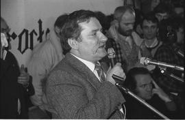 Warszawa, 25-02-1989. Teatr Powszechny. Dramaty Vaclava Havla „Audiencja” i „Protest” wystawione przez teatr pod nieobecność autora, który cztery dni wcześniej został skazany na 9 miesięcy wiezienia za działalność opozycyjną. N/z foyer teatru, Adam Michnik odczytuje protest przeciwko uwięzieniu Vaclava Havla. Fot. NAF Dementi