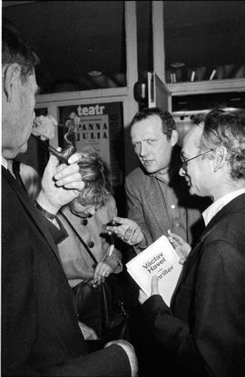 Warszawa, 25-02-1989. Teatr Powszechny. Dramaty Vaclava Havla „Audiencja” i „Protest” wystawione przez teatr pod nieobecność autora, który cztery dni wcześniej został skazany na 9 miesięcy wiezienia za działalność opozycyjną. N/z foyer teatru, od prawej Jan Lityński (w reku trzyma wydany w wydawnictwie podziemnym esej Havla „Thriller”), Adam Michnik, pierwszy z lewej John R. Davis, Jr, ambasador USA. Fot. NAF Dementi