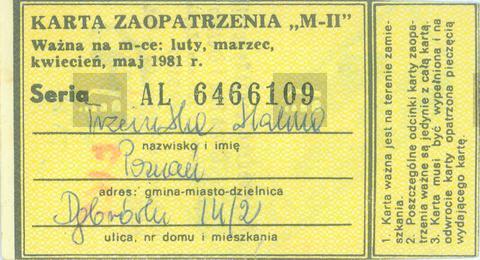 Karta zaopatrzenia "M-II" Ważna na m-ce: luty, marzec, kwiecień, maj 1981 r. Seria AL 6466109 w polu:nazwisko i imię / adres: gmina-miasto-dzielnica / ulica, nr domu i mieszkania Trzcińska Halina Poznań Dąbrówki 14/2 obok zasady korzystania z karty; na odwrocie częściowo widonczna pieczęć tekstowa, tusz fioletowy Wojewódzki Zespół Specjalistyczny Chorób Płuc i Gruźlicy im. Eugenii i Janusza Zeylandów 0293137 ul. Szamarzewskiego 62 - Tel... 60-569 Poznań (6) druga pieczęć tekstowa, tusz zielony Społem Oddział Handlu Detalicznego Poznań, Dąbrówki 1/2 3 adnotacje nieczytelne