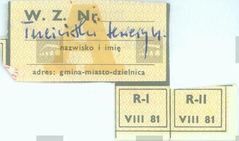 Kartka reglamentacyjna, na tle nadruku: A napis W. Z. Nr w polu: nazwisko i imię adres: gmina-miasto-dzielnica Trzciński Seweryn na odwrocie częściowo widoczna pieczęć tekstowa, tusz niebieski Wojewódzki Zespół Specjalistyczny Chorób Płuc i Gruźlicy ul. Szamarzewskiego 62, tel. 4... 60-569 Poznań (6) częściowo widoczna pieczęć tekstowa, tusz czerwony Urząd Miejski w Poznaniu Wydział Handlu i Usług Biuro... do reali... adnotacja długopisem od 3.8.1981 pieczęć zatarta, tusz szary "Społem"-Poznań Oddział Handlu Detalicznego... zachowane dwa kupony rezerwowe