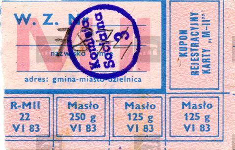 Kartka reglamentacyjna, zachowane 4 kupony i kupon rejestracyjny; adnotacja ręczna 7874 pieczęć okrągła z napisem Komisja Socjalna 3Na odwrocie częściowo zatarte, częściowo widoczne pieczęcie wystawców Kartki typu M-2 przyznawano pracującym fizycznie.