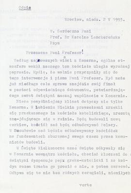 Odpis korespondencji z Karoliną Lanckorońską dotycząca sprawy odzyskania kościoła katolickiego w Komarnie. Mieczysław Pater opisuje w liście poprawiającą się sytuację katolików na wschodzie.
