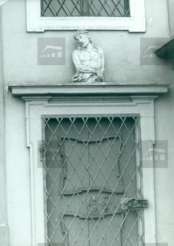 [północne wejście do wzniesionego w 1713 r. kościoła pw. Narodzenia Najświętszej Marii Panny w Psarach, obecnie filialnego - należącego do parafii rzymskokatolickiej pw. św. Jakuba w Małujowicach; nad portalem na gzymsie popiersie Chrystusa w koronie cierniowej i ze związanymi rękoma]