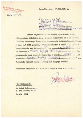 Decyzja Wojewódzkiej Usługowej Spółdzielni Pracy w Koszalinie dla Antoniego Skibińskiego na stanowisku Głównego Ekonomisty.