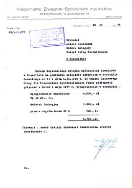 Pismo Regionalnego Związku Spółdzielni Inwalidów w Koszalinie do Antoniego Skibińskiego o przyznanym wymiarze wynagrodzenia.