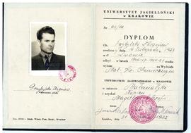 Dyplom ukończenia studiów przez Zbigniewa Przybylskiego na Wydziale Matematyczno- Fizyczno-Chemicznym Uniwersytetu Jagiellońskiego w Krakowie w zakresie matematyki.