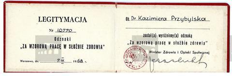 Legitymacja przyznania odznaki " Za wzorową pracę w służbie zdrowia" dla Kazimiery Przybylskiej o numerze 10770