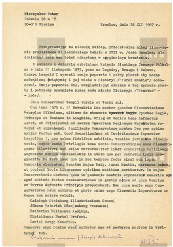 Kopia listu z tłumaczeniem łacińskiego tekstu.