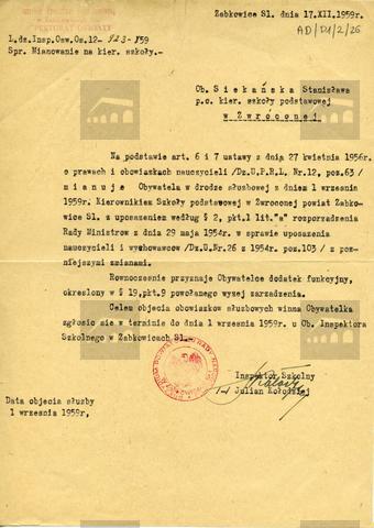 mianowanie Stanisławy Siekańskiej kierownikiem Szkoły Podstawowej dziś Szkoła Podstawowa z Oddziałem Przedszkolnym w Zwróconej w pow. ząbkowickim dziś woj. dolnośląskie z dniem 01.09.1959 r.