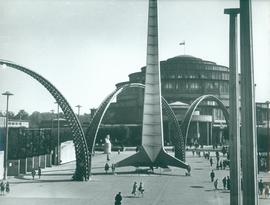 Na zdjęciu Hala Stulecia (Hala Ludowa) wraz z iglicą, w otoczeniu scenografii zbudowanej na potrzeby Wystawy Ziem Odzyskanych.