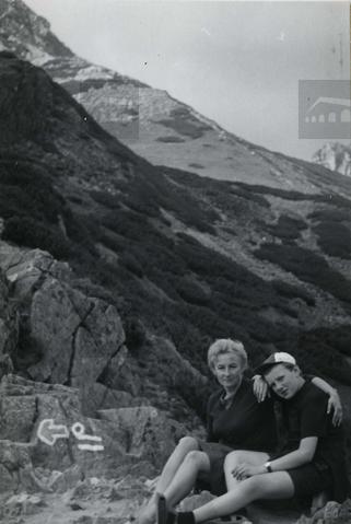 Mieczysław Piotrowski z matką odpoczywający na szlaku prowadzącym na Giewont [1894 m.n.p.m.]. W tle widoczny szczyt góry z charakterystycznym krzyżem, zbudowanym w 1901 r.