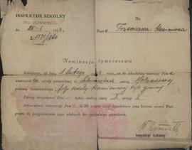 Zawiadomienie o zmianie statusu gminazjum z prywatnego na państwowe wysłane przez dyrektora szkoły do jej nauczyciela, Kazimierza Trzeciaka, Oszmiana, Rzeczpospolita Polska (obecnie Białoruś) 7.02.1931.
