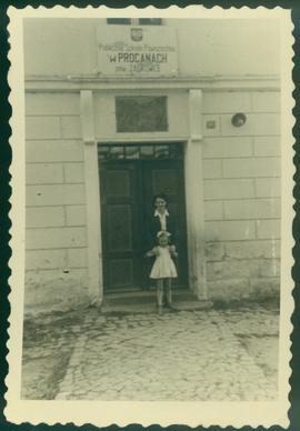 Stanisława Siekańska, jedna z pierwszych nauczycielek organizujacych polską szkołę w Procanch (Zwróconej), z córką Grażyną przed wejściem do budynku szkolnego, 1945-1947. Na tablicy nad wejściem widoczny napis: "Publiczna Szkoła Powszechna w Procanach, pow. Ząbkowice" - w 1947 roku wieś Procany została przemiananowana na Zwróconą.