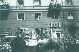 pochód pierwszomajowy na ówczesnej ul. Karola Świerczewskiego (dziś: Józefa Piłsudskiego) przy budynku nr 34-36; na elewacji neon Polskich Linii Lotniczych "Lot"