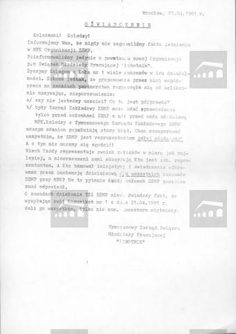 Tymczasowy Zarząd Związku Młodzieży Pracującej "Robotnik" informuje, że nigdy nie negował faktu istnienia w MPK organizacji Związku Socjalistycznej Młodzieży Polskiej, następnie odnosi się do propozycji współpracy, wysuniętej przez ZSMP, odrzucając przedstawione przezeń rozumienie partnerstwa i wskazując, że Zarząd Zakładowy ZSMP może zdawać sprawozdanie jedynie przed członkami organizacji, a nie przed całą młodzieżą zakładową, której według autorów oświadczenia nie jest reprezentantem; oświadczenie kończy pytanie retoryczne o to, kto hamował inicjatywy i świadczenia kierowane przez instancję dzielnicową dla wszystkich członków ZSMP przy MPK oraz stwierdzenie, że członkowie Zarządu ZMP "Robotnik", jako jedyni nie otrzymali komunikatu ZSMP z dnia 21.04.1981, co świadczyć ma o zasadach działania ZSMP