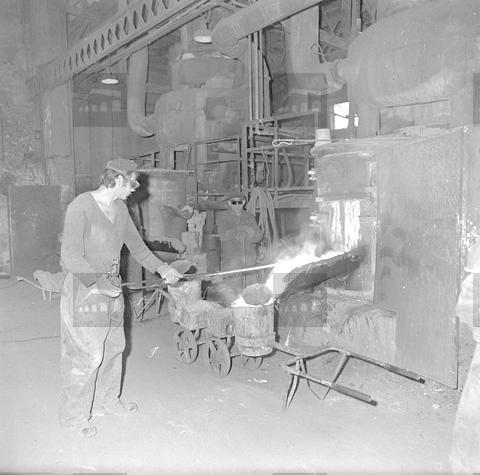 N/z pracownicy Hutmenu przy piecu hutniczym.