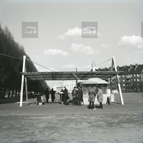 Jeden z placów w Lubinie, grupa osób przed kioskiem.