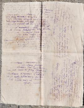 dwustronnie zapisany niebieskim atramentem kawałek tkaniny