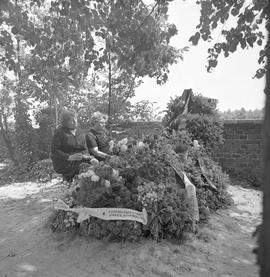 N/z rodzina obok grobub Zofii Smyrek pokryty wieńcami pogrzebowymi na Cmentarzu Parafialnym Rzymskokatolickiej Parafii pw. Św. Jacka.