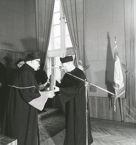 Uroczystość nadania tytułu doktora honoris causa Politechniki Wrocławskiej prof. Kazuo Nakamoto (USA, z pochodzenia Japończyk, prof. Uniwersytetu Marquette w Milwaukee, specjalność: strukturalna chemia nieorganiczna i fizyczna, spektroskopia molekularna) i prof. Bengtowi Ranby'emu (Szwecja, prof. Królewskiego Instytutu Technologicznego w Sztokholmie, specjalność: chemia i fizykochemia polimerów). N/z: aktu promocji prof. Bengta Ranby'ego dokonuje prof. Henryk Kuczyński.