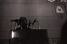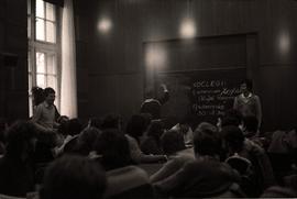 Spotkanie na sali wykładowej Politechniki Wrocławskiej z Jackiem Kuroniem (stojącym na mównicy, polskim politykiem, jednym z przywódców opozycji w PRL).