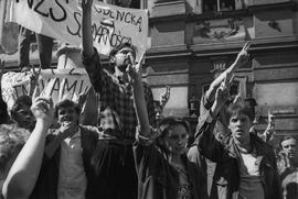 Wrocław, 05-05-1988. Pl. Uniwersytecki, wiec zorganizowany przez Niezależne Zrzeszenie Studentów Uniwersytetu Wrocławskiego podczas którego ogłoszono okupacyjny strajk solidarnościowy ze strajkującymi robotnikami min. w Stoczni Gdańskiej ,n/z od lewej Przemysław Koelner, Wiesław Mielcarski, Paweł Kocięba.