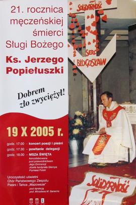Motyw zmartwychwstania Jezusa Chrystusa wychodzącego z grobu i trzymającego w rękach chorągiew białą z czerwonym krzyżem, do której dołączono wstęgę z napisem: Solidarność; ponad głową Chrystusa Duch Święty w postaci gołębicy, obok grobu trzy postacie młodych aniołów, w lewym dolnym rogu napis: Wesołego Alleluja; przy lewej krawędzi zdjęcia portretowe ks. Jerzego Popiełuszki i papieża Jana Pawła II
