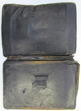 Skórzany porfel użytkowany przez Piotra Grzyminskiego [powstańca wielkopolskiego], skóra, I poł. XX w. Portfel męski ze skóry licowanej, brązowy, rozkładany, widoczne ślady intensywnego użytkowania (skóra mocno przetarta od strony zewnętrznej i na zgięciach, ubytki nici na szwach, zmarszczenie materiału)