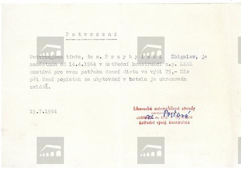 Potwierdzenie, że Zbigniew Przybylski jest zatrudniony od 1964 r. w zakładach LIAZ, otrzymuje na swoje potrzeby całodzienną dietę w wysokości 75 CZK, natomiast opłata za zakwaterowanie w hotelu jest uiszczana oddzielnie.