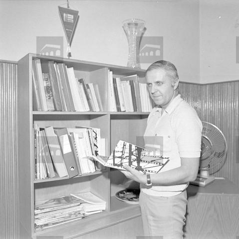 Zdjęcie portretowe pracownika biurowego "Polaru" stojącego obok półki z książkami i dokumentami.
